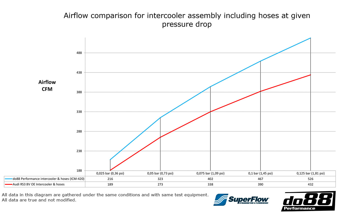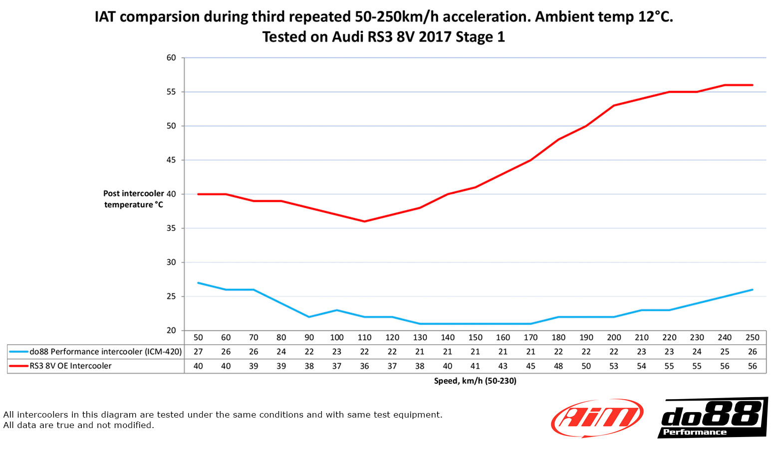 Pendant nos tests rigoureux d'efficacité de refroidissement sur une piste d'atterrissage fermée, nous n'avons pas seulement constaté une énorme réduction de la température de l'air d'admission, mais le Dragy que nous avions dans la voiture a montré une réduction consécutive du temps d'accélération de 100 à 200km/h d'une demi-seconde avec notre intercooler en place !