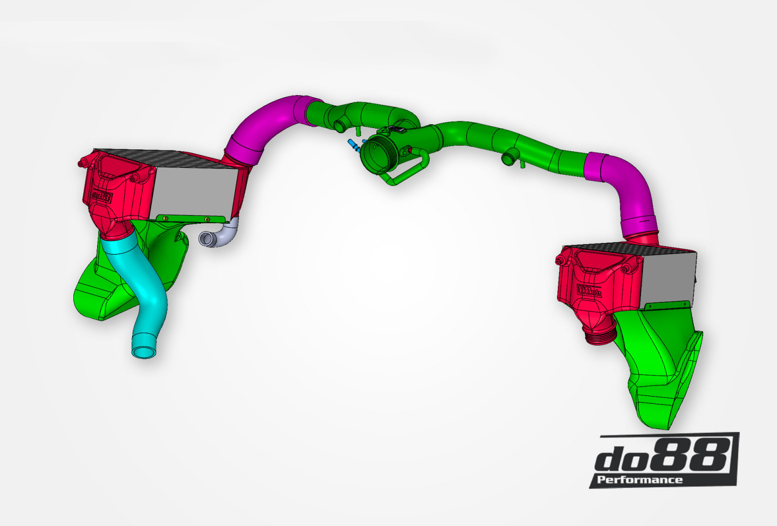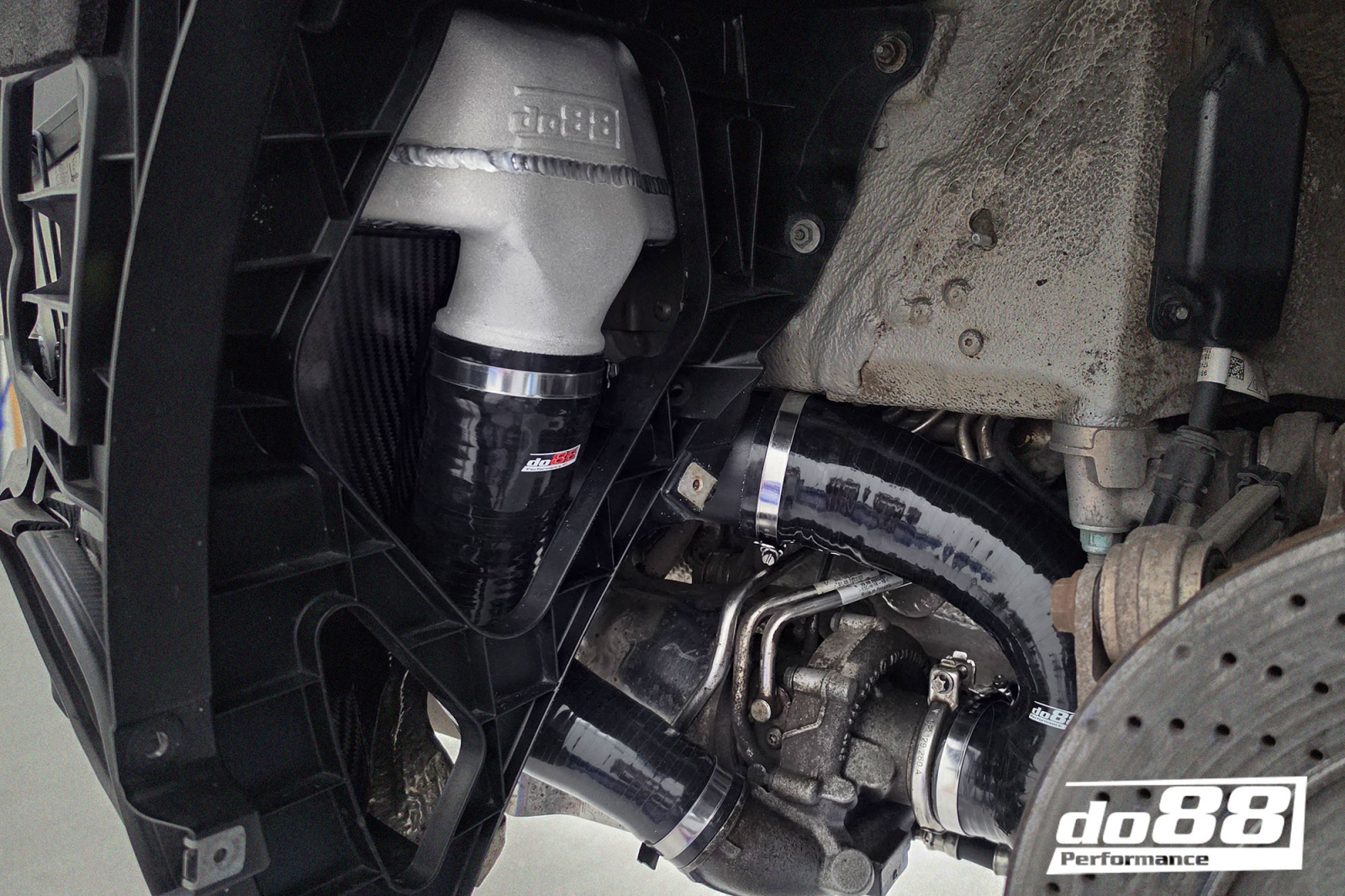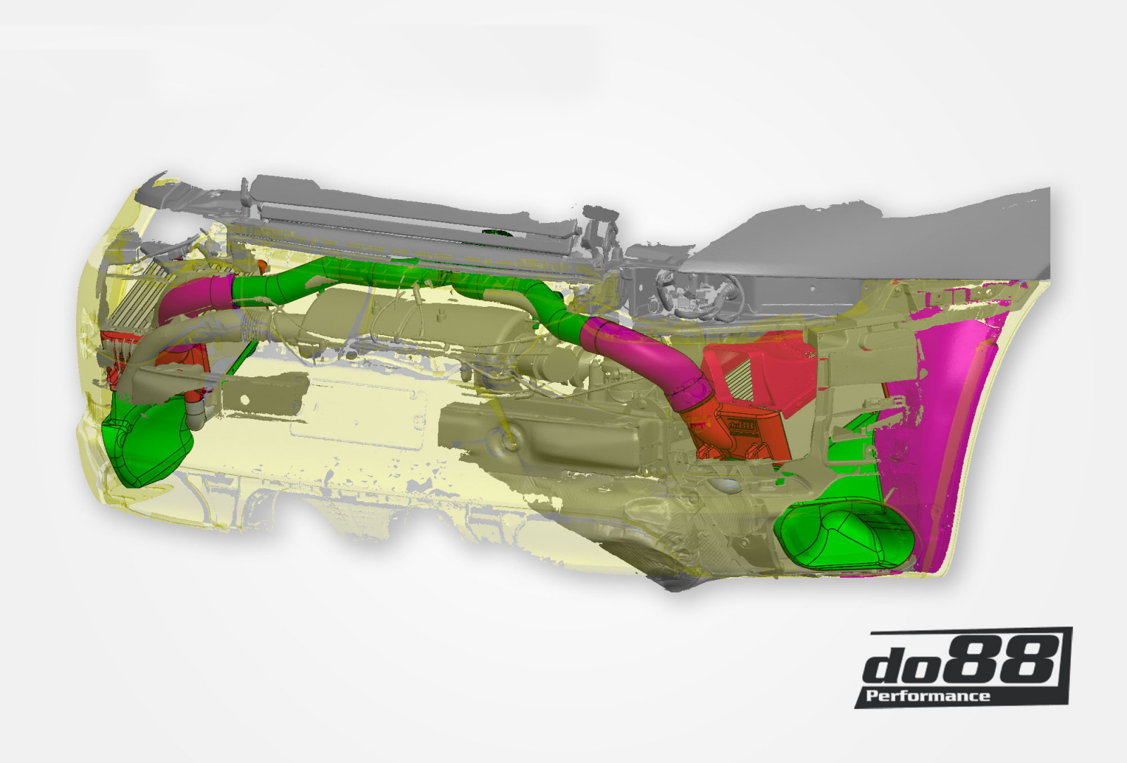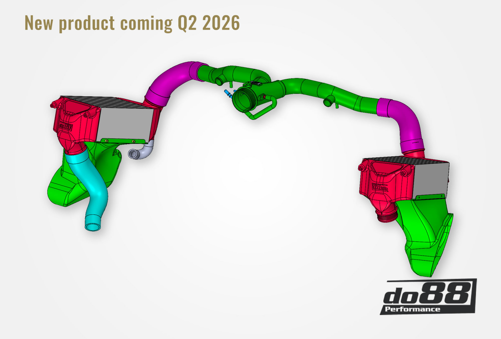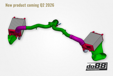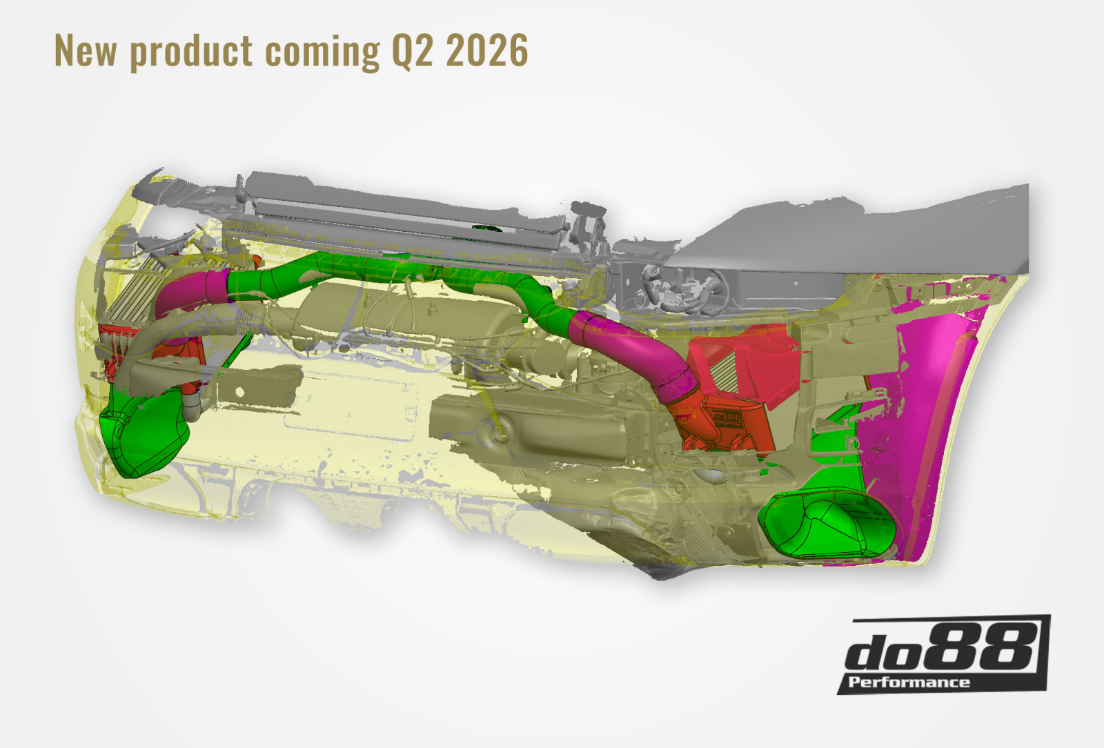 Pour répartir de manière optimale le flux sur l'ensemble du noyau, nous utilisons des réservoirs moulés optimisés pour le flux. Un réservoir bien conçu est essentiel pour maximiser les propriétés de transfert de chaleur et de flux. Le débit et la capacité de refroidissement dépendent directement des dimensions du noyau et pour utiliser un noyau aussi épais que possible, nous avons remplacé les guides d'air supérieurs par des guides en fibre de carbone. Ceux-ci sont conçus par do88 à partir de numérisations 3D, ce qui garantit un ajustement parfait tant contre la carrosserie de la voiture que contre nos grands refroidisseurs d'air de suralimentation.