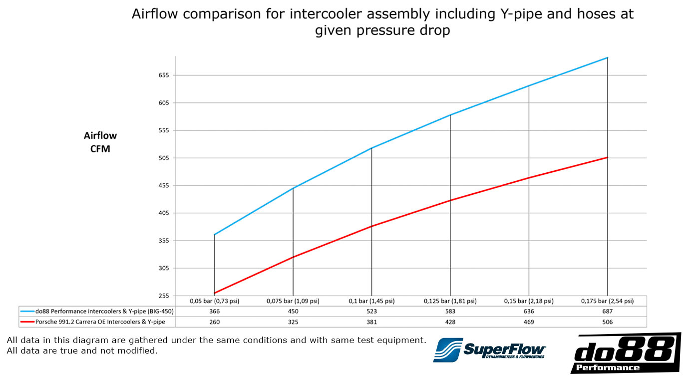 Le refroidissement est important, tout comme le flux d'air. Après de nombreuses heures de développement, de perfectionnement des réservoirs d'extrémité et de choix d'un noyau pour répondre à notre demande, le résultat est un intercooler beaucoup plus efficace en termes de transfert de chaleur et de flux d'air. En utilisant notre banc d'essai Superflow SF-1020 Pro, le flux d'air est vérifié comme un système complet, avec des durites à la fois à l'entrée et à la sortie, pour les intercoolers OEM 991 et les intercoolers do88 performance.