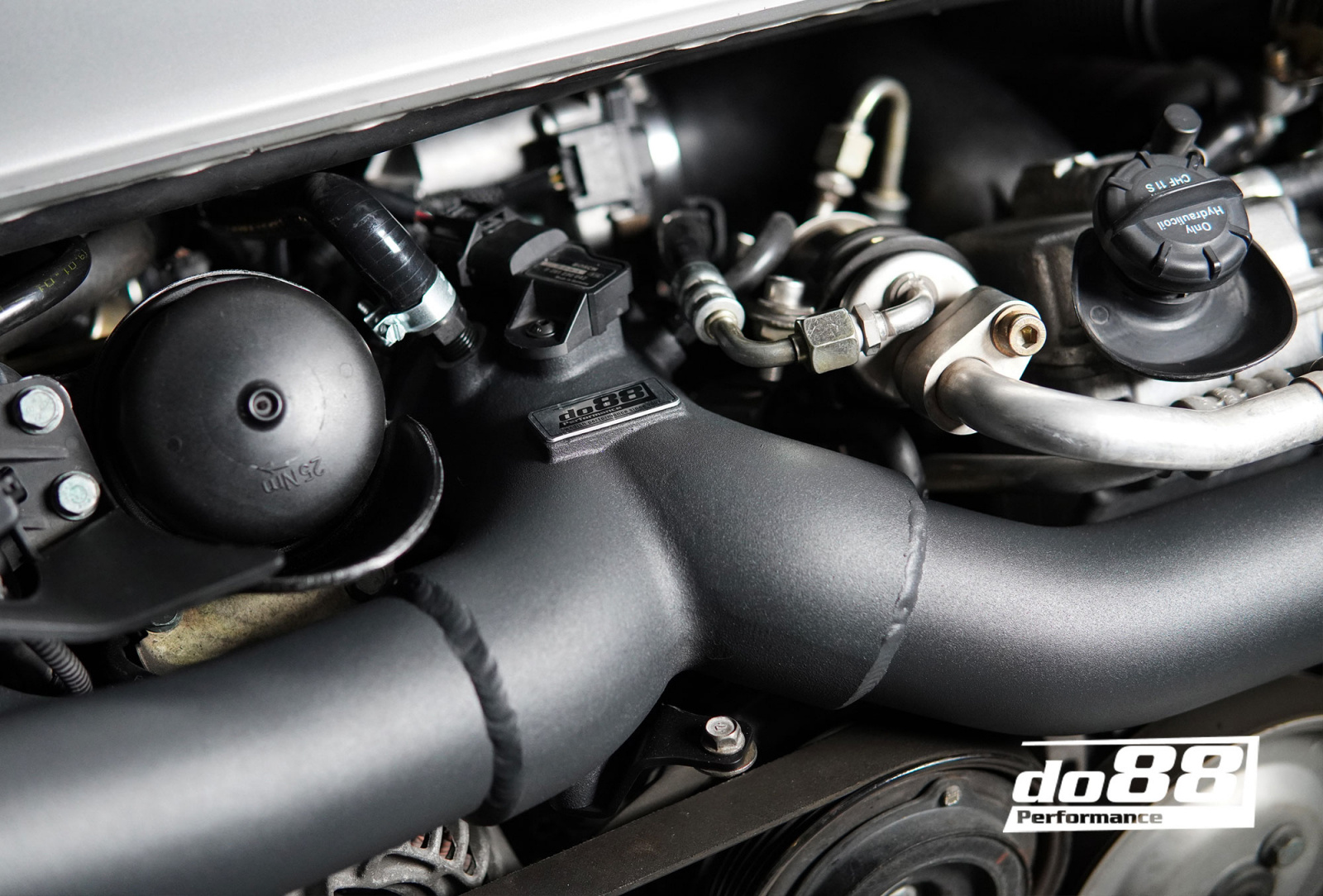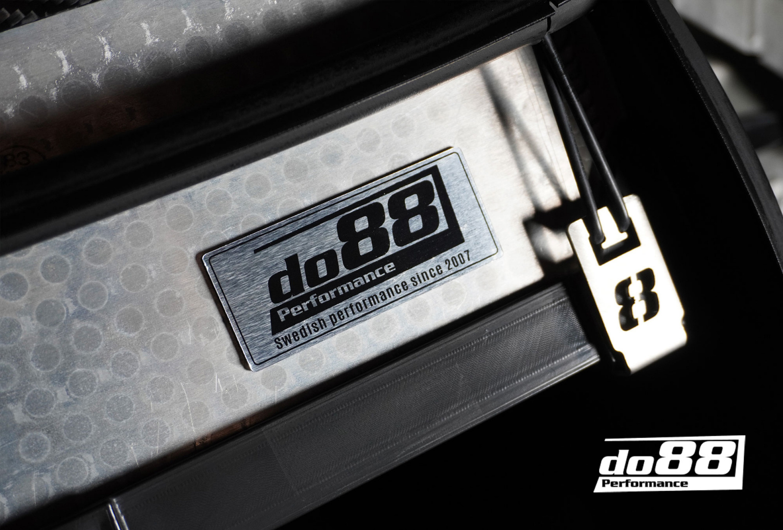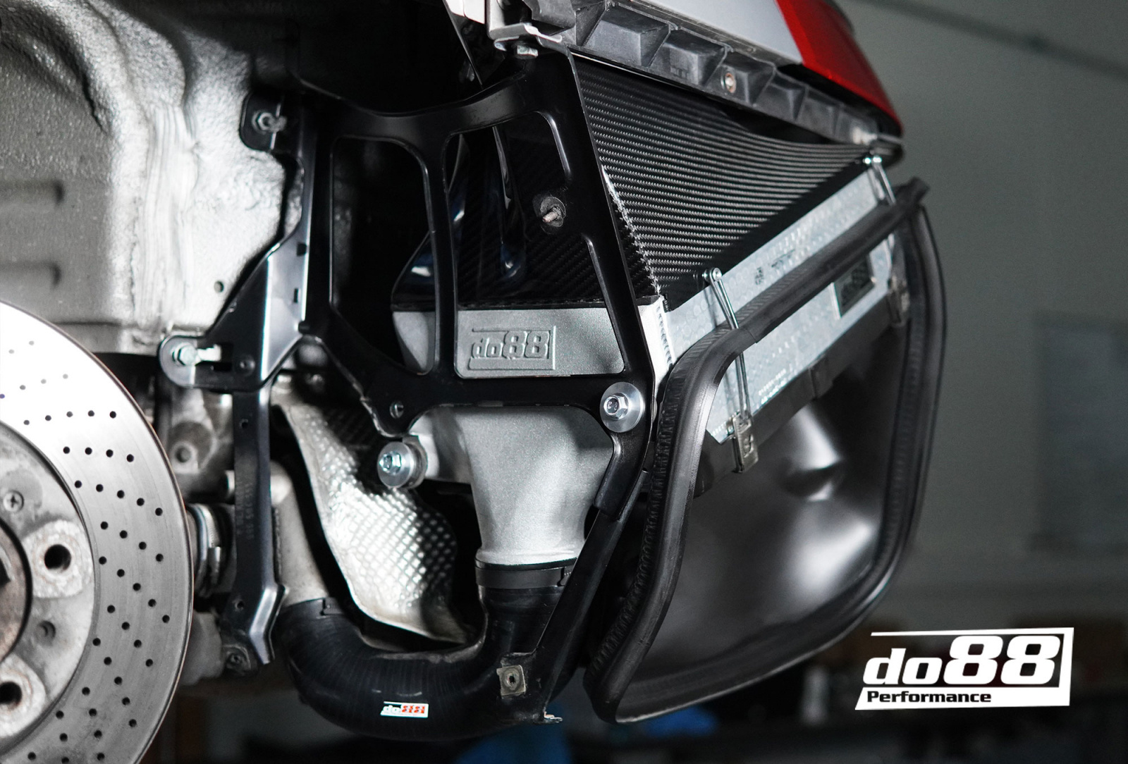 Pour répartir de manière optimale le flux sur l'ensemble du noyau, nous utilisons des réservoirs moulés optimisés pour le flux. Un réservoir bien conçu est essentiel pour maximiser les propriétés de transfert de chaleur et de flux. Le débit et la capacité de refroidissement dépendent directement des dimensions du noyau et pour utiliser un noyau aussi épais que possible, nous avons remplacé les guides d'air supérieurs par des guides en fibre de carbone. Ceux-ci sont conçus par do88 à partir de numérisations 3D, ce qui garantit un ajustement parfait tant contre la carrosserie de la voiture que contre nos grands refroidisseurs d'air de suralimentation.