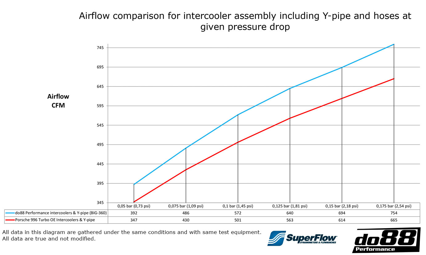 Avec notre banc d'essai interne Superflow SF-1020 Probench, le débit d'air est confirmé en tant que système complet, avec des durites à l'entrée et à la sortie, tant pour les refroidisseurs d'air de suralimentation OEM 996 que pour les refroidisseurs d'air de suralimentation do88 performance.