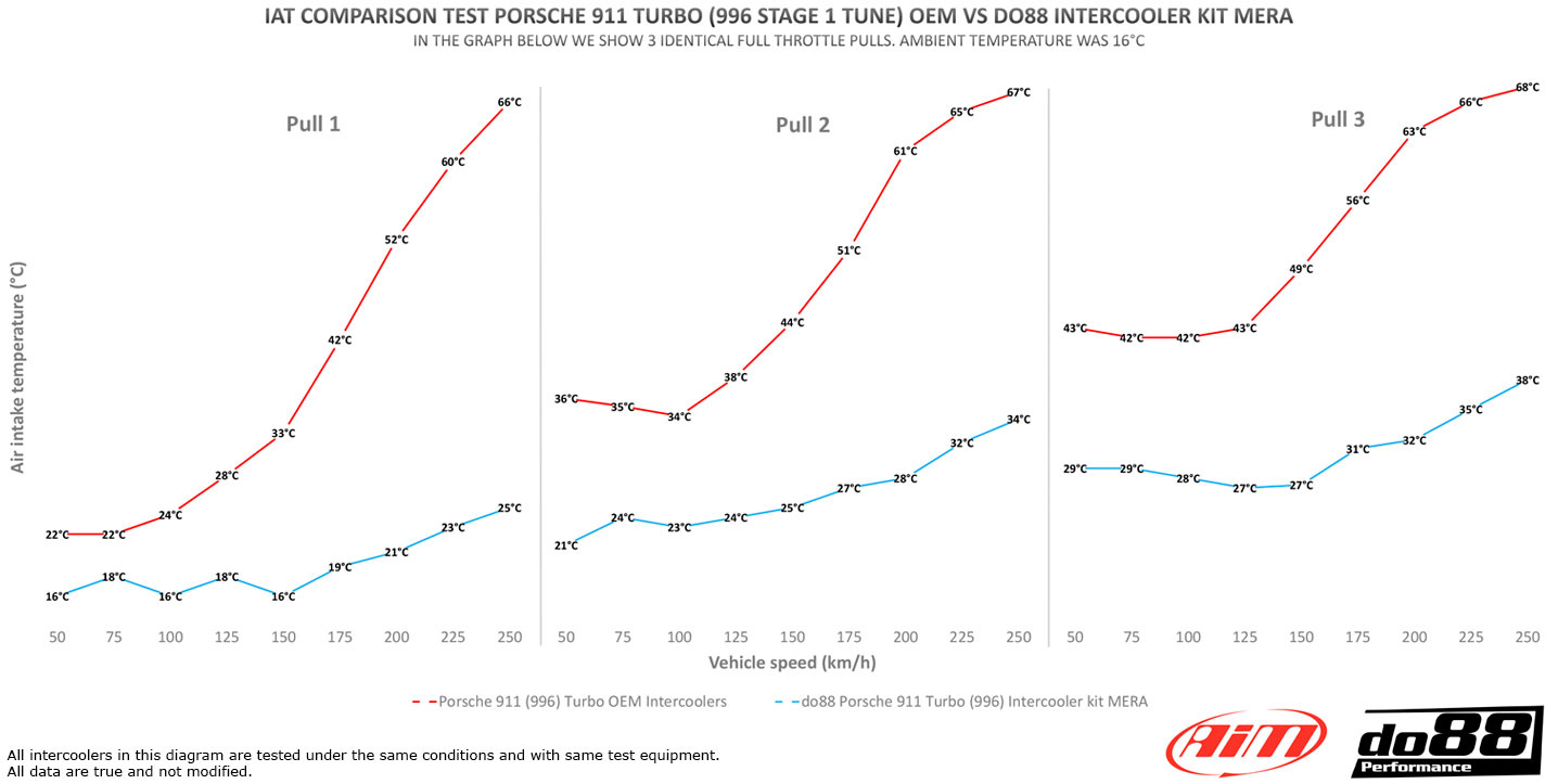 En ce qui concerne les performances, les refroidisseurs d'air de suralimentation do88 réduisent efficacement la température d'admission ! Le diagramme illustre la différence par rapport aux refroidisseurs d'air de suralimentation d'origine (OEM) du 996. Les données ont été collectées à l'aide d'un enregistreur de course AIM lors de trois séries consécutives immédiates. Des accélérations à pleine charge entre 50 et 250 km/h ont été réalisées sur une Porsche 996 préparée en stage 1. Aucun refroidissement entre les séries, seulement une accélération à pleine charge. Le test a été réalisé comme suit : tout d'abord, trois séries ont été effectuées avec la voiture équipée de refroidisseurs d'air de suralimentation OEM. Puis les pièces ont été rapidement changées pour les refroidisseurs d'air de suralimentation do88. Ensuite, trois autres séries ont été réalisées exactement de la même manière qu'avec les pièces OEM. La baisse de la température de l'air d'admission est significative, avec une différence maximale de 41°C, voir le diagramme !