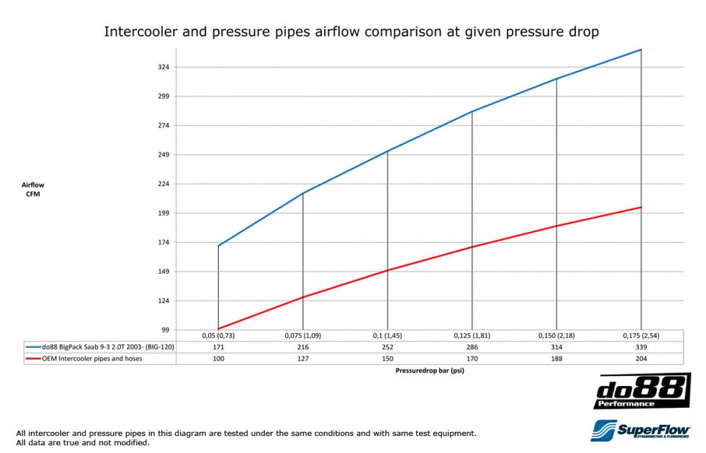 Ce paquet est destiné à vous qui avez d’objectifs à puissance élevés et veulent passer à l'amélioration absolue! Le ''juste'' passage à nos intercoolers de performance est une énorme amélioration. Avec notre tube de pression, l'amélioration est énorme. Notre tube de pression a un débit nettement meilleur que l'original, lequel nous avons vérifié en voiture et dans notre propre SuperFlow SF-1020-banc de flux.