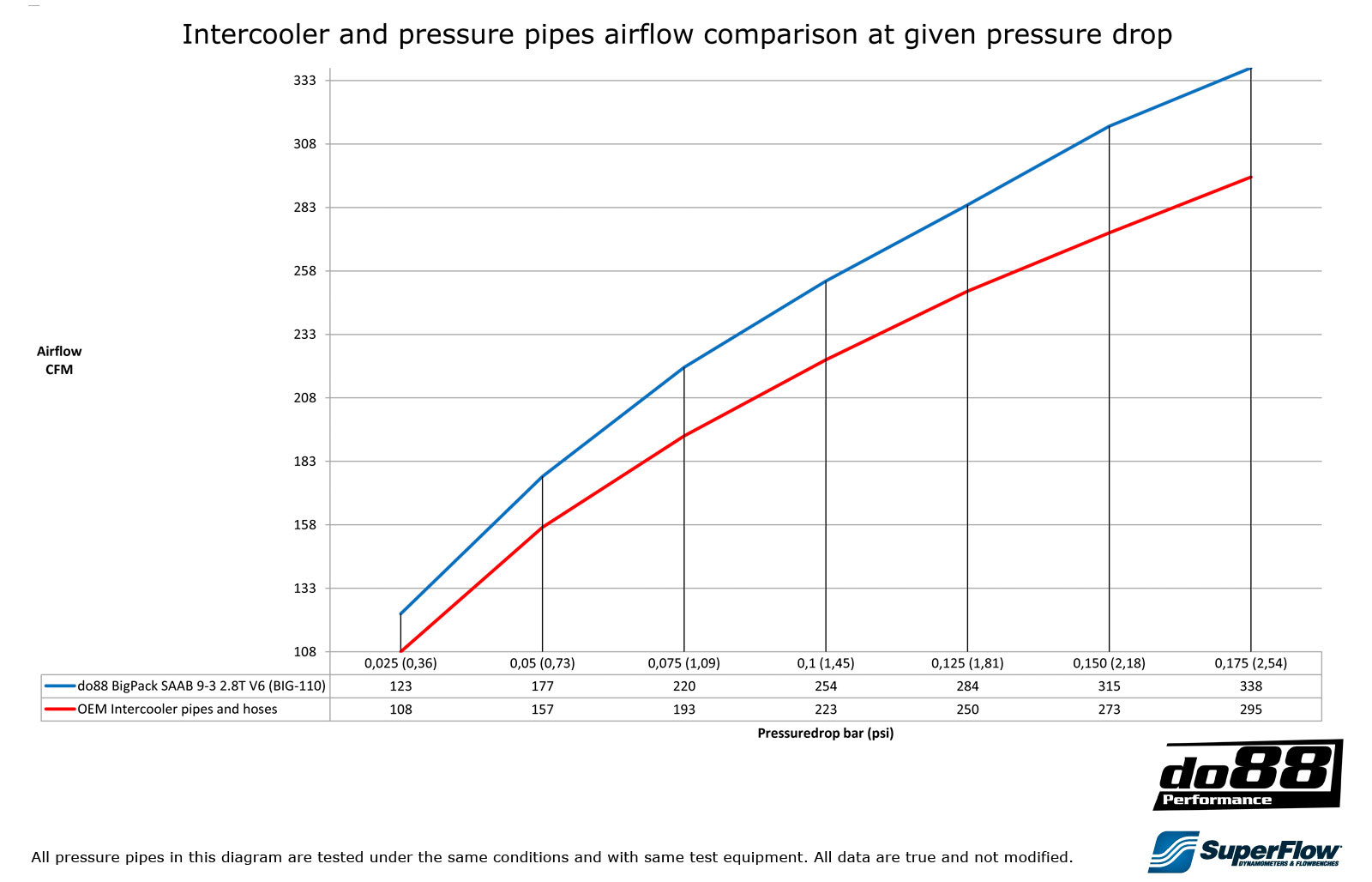 Ce paquet est destiné à vous qui avez d’objectifs à puissance élevés et veulent passer à l'amélioration absolue! Le ''juste'' passage à nos intercoolers de performance est une énorme amélioration. Avec notre tube de pression, l'amélioration est énorme. Notre tube de pression a un débit nettement meilleur que l'original, lequel nous avons vérifié en voiture et dans notre propre SuperFlow SF-1020-banc de flux.