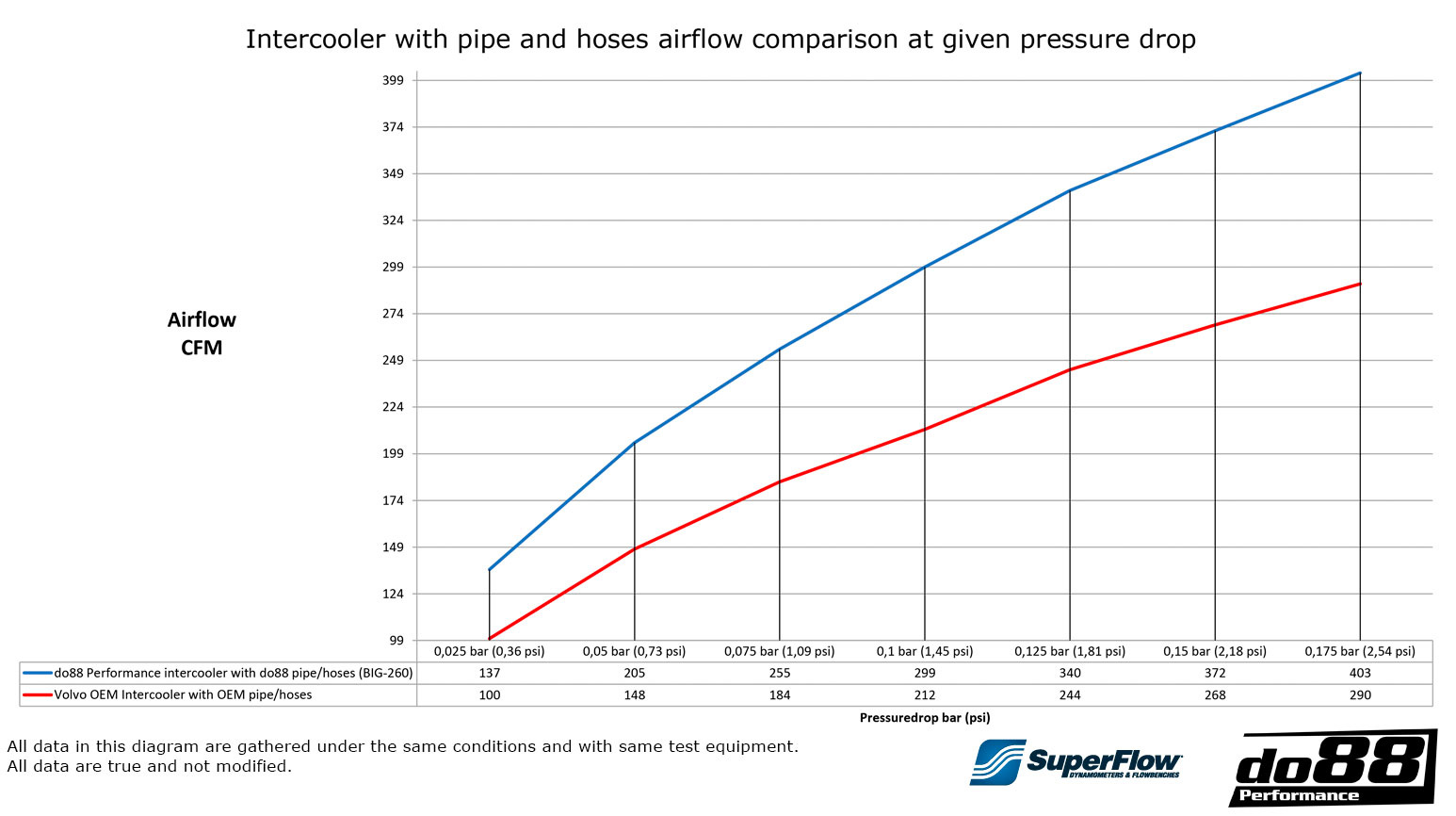 Ce paquet est destiné à vous qui avez d’objectifs à puissance élevés et veulent passer à l'amélioration absolue! Le ''juste'' passage à nos intercoolers de performance est une énorme amélioration. Avec notre tube de pression, l'amélioration est énorme. Notre tube de pression a un débit nettement meilleur que l'original, lequel nous avons vérifié en voiture et dans notre propre SuperFlow SF-1020-banc de flux.