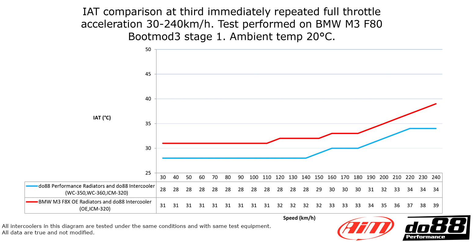 Réduire la température de l'eau dans ce circuit est directement lié à une meilleure refroidissement de l'air de charge (IAT plus bas). Pour cette raison, il est important d'avoir des radiateurs haute performance dans ce système pour maintenir une IAT aussi basse et stable que possible lors de la conduite difficile. Au cours de tous les tests que nous avons effectués lors du développement de notre gamme complète de produits BMW F8X M3 / M4, nous voyons clairement comment la puissance maximale est directement liée à l'IAT (Température de l'air d'admission).
