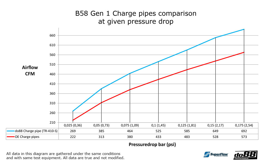 - 23 % de flux en plus par rapport à l'OEM, avec 649 CFM @ 150mbar (2,17 psi) comparé à l'OEM 528 CFM.