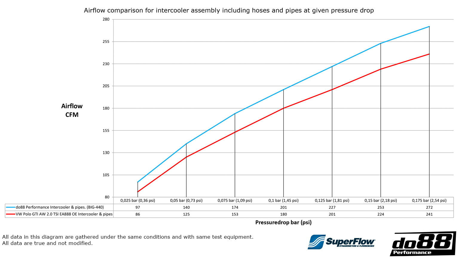 N'oubliez jamais que l'intercooler OE a été conçu pour le niveau de puissance pour lequel la voiture a été construite à l'origine. Une augmentation de la puissance ou même une utilisation très intensive de la voiture dans sa version standard peut entraîner une performance insuffisante de l'intercooler OE. Ainsi, ce n'est qu'après une modification de la cartographie moteur que le BigPack do88 apportera une augmentation de performance par rapport à l'intercooler OE !