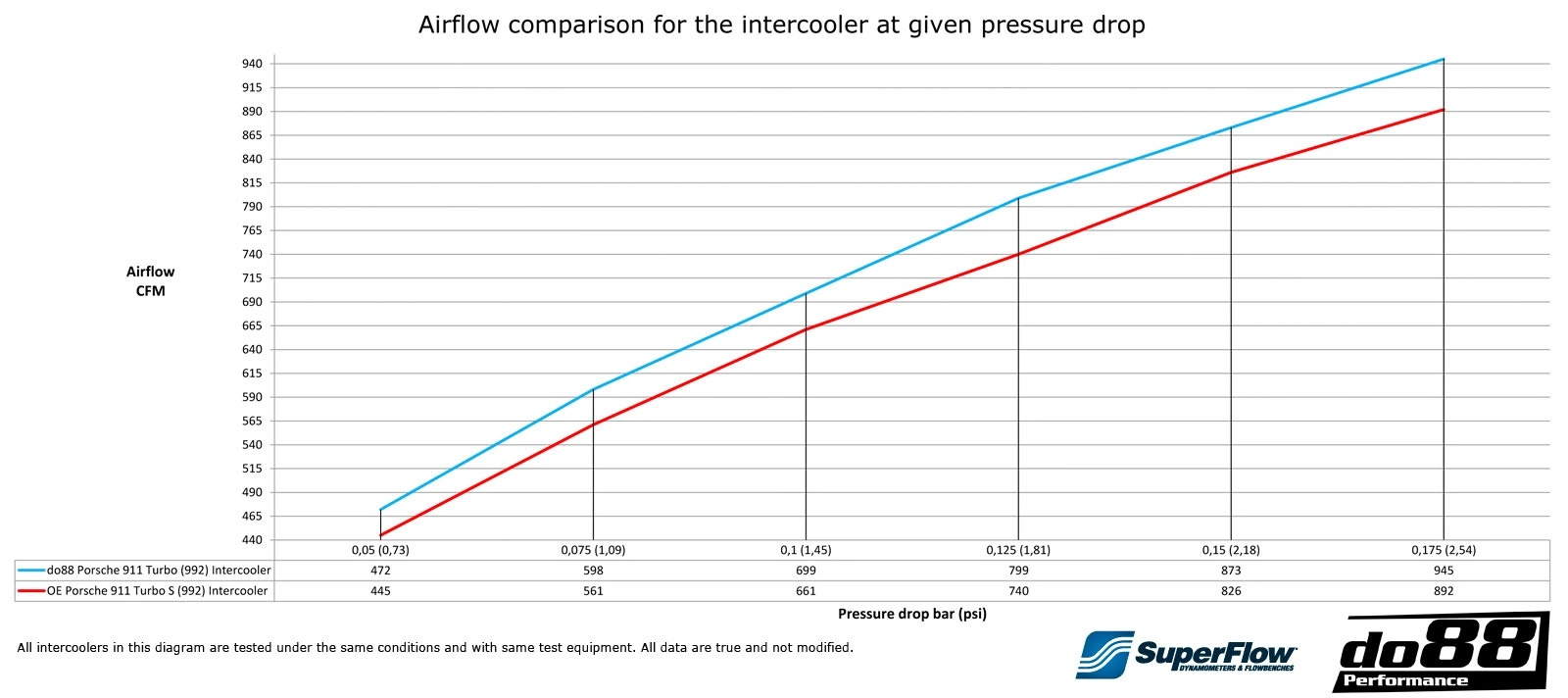 Le refroidissement est important, et le débit d'air l'est tout autant. Après de nombreuses heures de développement, d'affinage des réservoirs d'extrémité et de choix d'un noyau pour répondre à nos exigences, le résultat est un intercooler qui est beaucoup plus efficace en termes de transfert de chaleur et de débit d'air. En utilisant notre banc d'essai en interne, le banc d'essai SF-1020 SuperFlow, le débit d'air est vérifié à la fois pour les intercoolers do88 et les unités OE 992. Ce que vous voyez est ce que vous obtenez – une véritable performance !