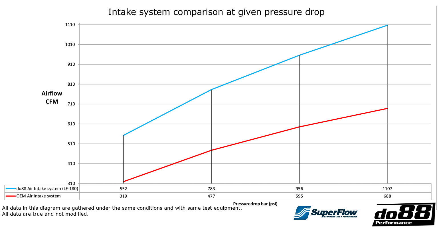 Le système d'admission do88 a un débit d'air à une baisse de pression de 0,1 bar de 1107 CFM par rapport au système d'origine qui a 688 CFM!