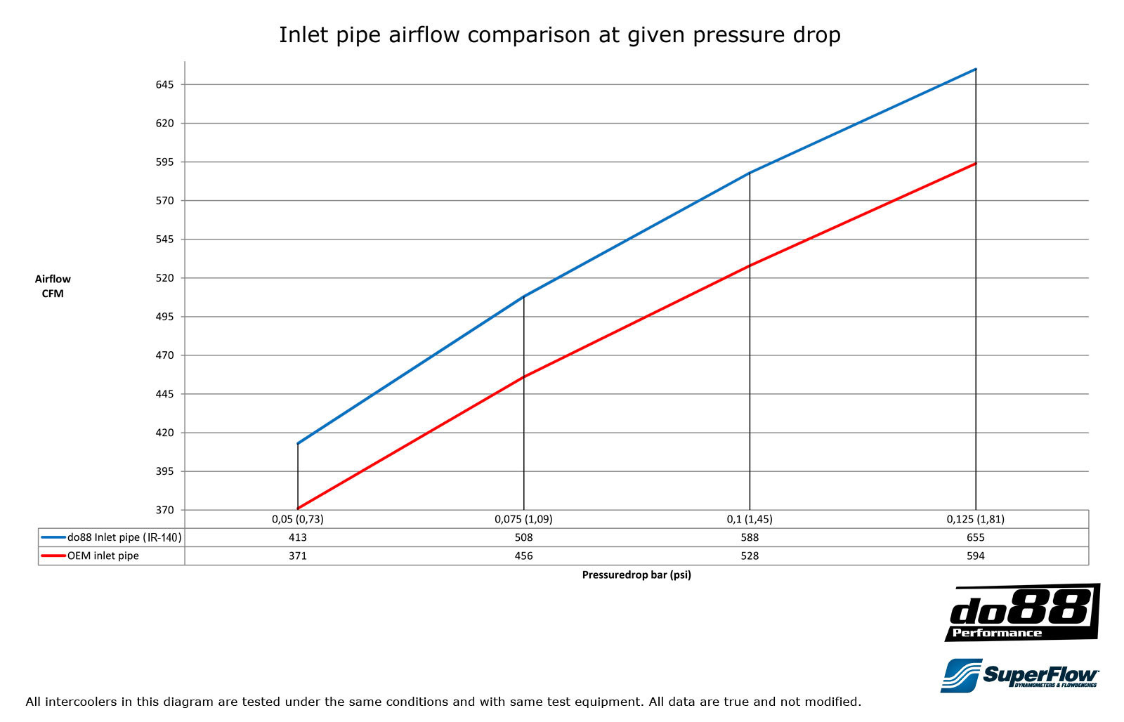 Les tubes d'admission do88 ont un débit d'air à une baisse de pression de 0,125 bar de 655CFM, par rapport au tube original de 594CFM! Le tube d'admission est composé d’un tube en aluminium extrudé à 3'' qui a été plié par mandrin d'une seule pièce à la bonne forme! Durites en silicone spécialement conçus de la plus haute qualité avec 4 couches de renforcement polyester/aramide pour traiter de températures élevées et de pressions basses.